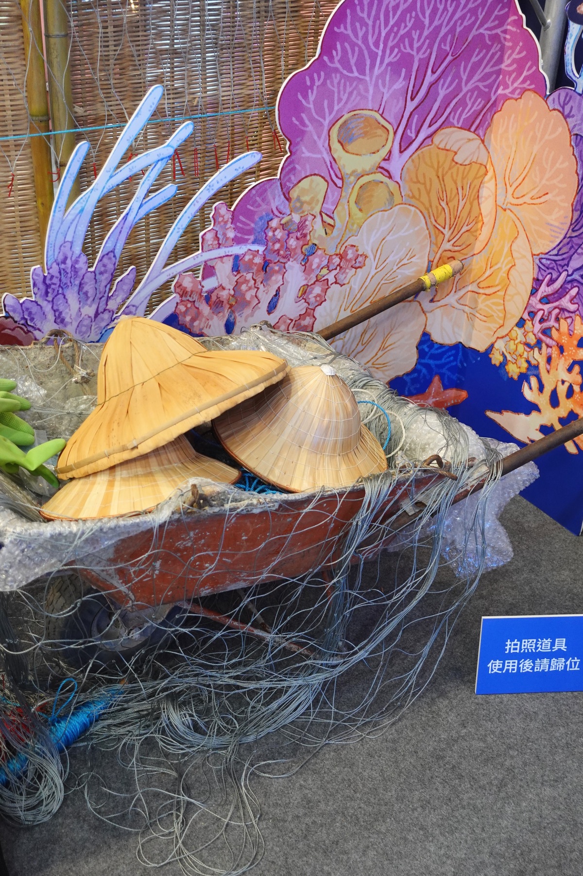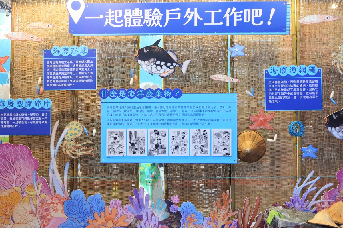 在臺灣國際兒少書展的《海巫事務所》專區,運用海廢漁網與碎片布置展區。