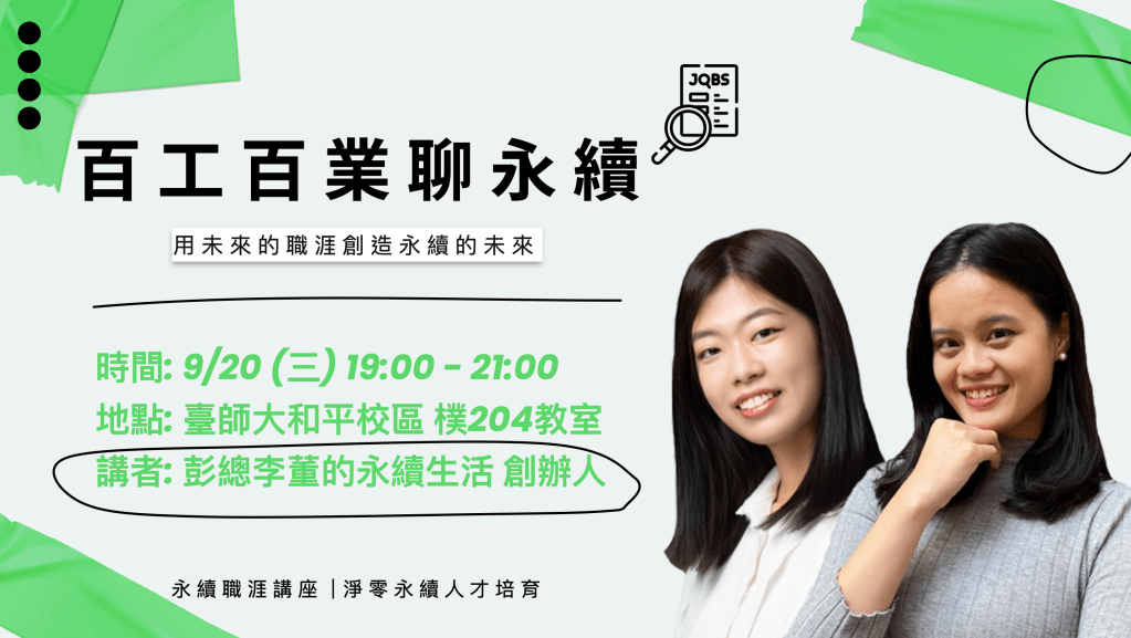 這次的講座活動與臺灣師範大學 永續出師共同主辦,以「永續職涯探索」為主軸,由計畫夥伴*《彭總李董的永續生活》創辦人——彭千容、李翊僑,介紹各個科系類別能夠延伸出的永續職涯選擇,並針對其熟悉的職業:智庫研究員、環安衛顧問以及 Podcast 訪談過的職業、永續議題自媒體經營,進行更深入的分享,包括職業現況、 所需專長、持續進修的一些訣竅與資源等。