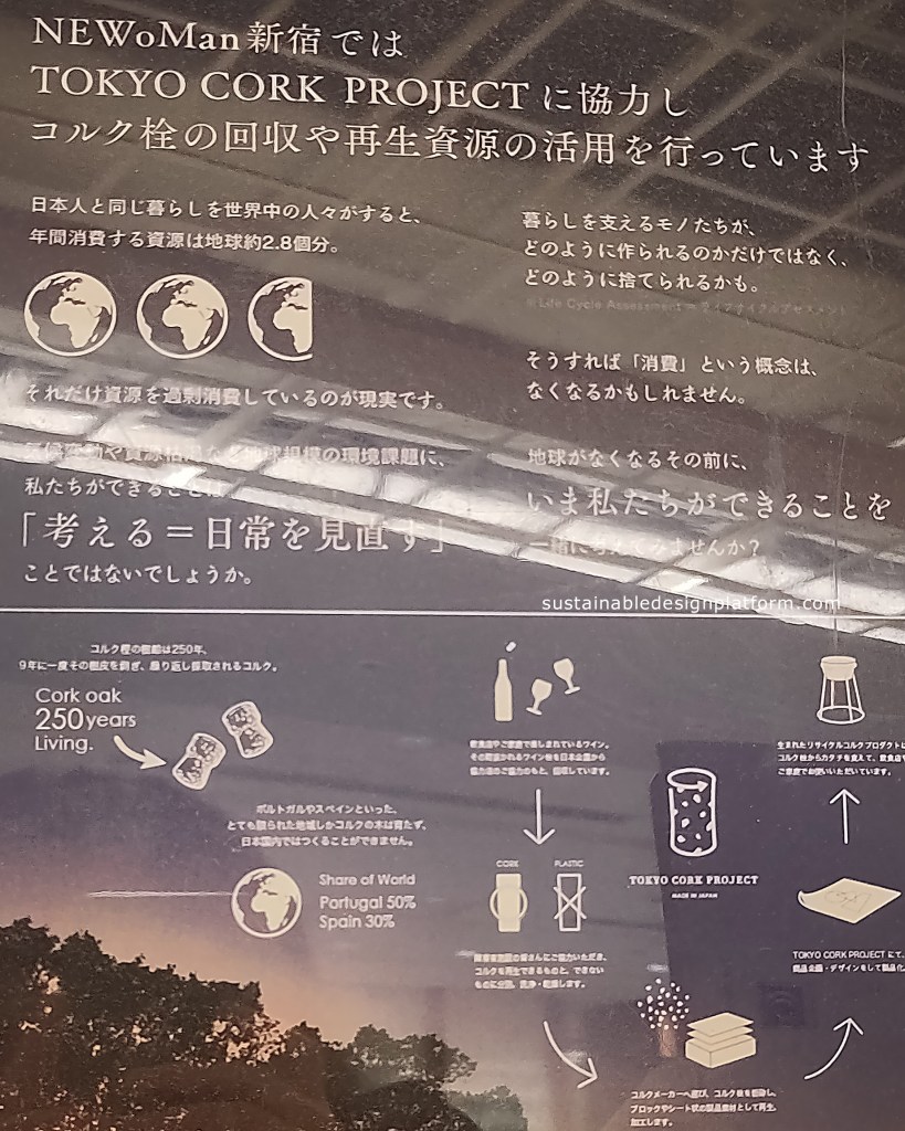 疫情旅遊解禁後,出國前會先網路搜尋當地有沒有永續相關的品牌或展覽,可以順道安排去看看(市場調查),最後發現都查不太到什麼資料(亞洲),沒想到東京行住新宿,第一晚就意外在NEWoMan Shinjuku發現了不同樓層的回收軟木塞計畫及軟木再製設計,驚嘆TOKYO CORK PROJECT把廢棄物設計得很美!