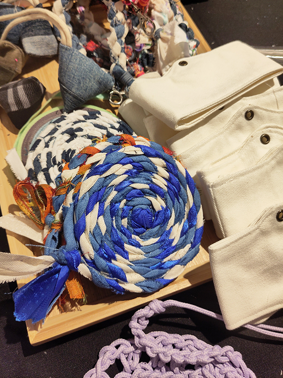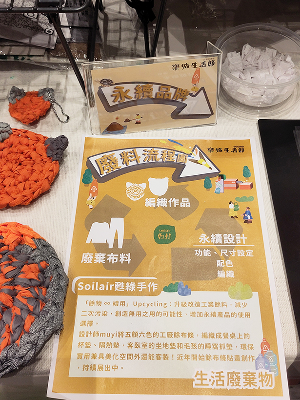 「餘物 ∞ 續用」布廠餘布條經色彩規劃後手編成生活用品如:杯墊、隔熱墊、坐墊、置物籃、毛孩窩,以及藝術貼畫。-內容擷取自官方粉絲頁