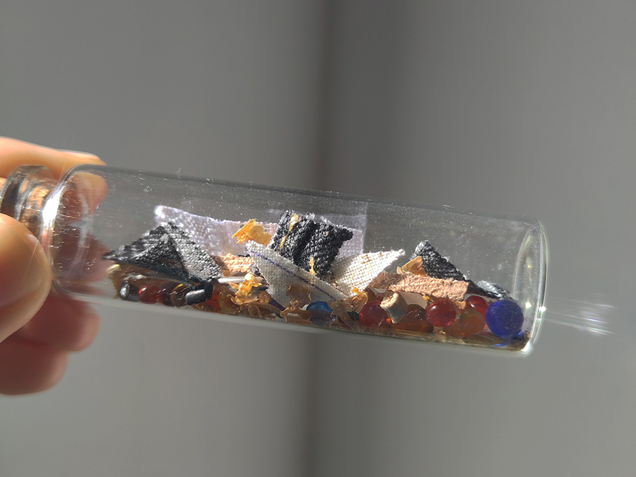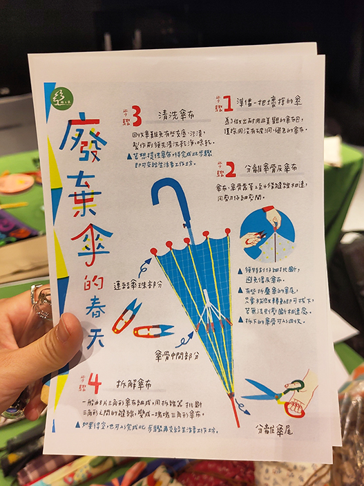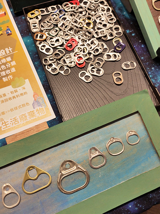 這次活動蠻特別的是主辦提供一個漂流玻璃瓶,讓參觀者可以到不同永續品牌攤位蒐集該品牌提供的廢料,例如餘布、稻殼、回收玻璃、海廢塑膠粒等等,從蒐集的過程中也可以更進一步了解品牌的產品再生材料使用,不僅具有教育意義,小朋友還可以到DIY區用亮片、紙膠帶等素材加工成吊飾帶回家紀念。