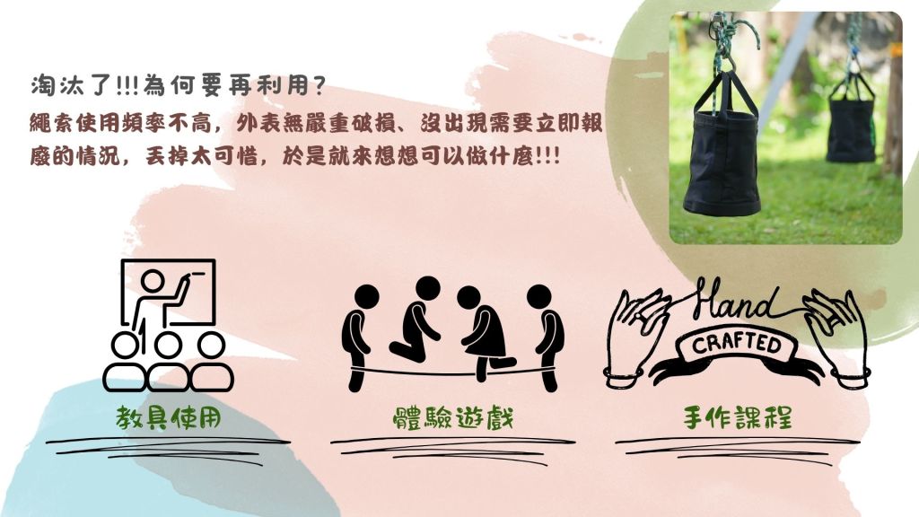 這次與家扶基金會大同育幼院合作的升級再造專案,使用的再生材料是汰舊換新的動力繩(原本的用途為院區體驗教育場高低空設備的繩索),而串起連結的,是因院方工作人員搜尋到永續設計平台的海廢漁網繩再生案例,來訊詢問我是否能再利用這些動力繩。