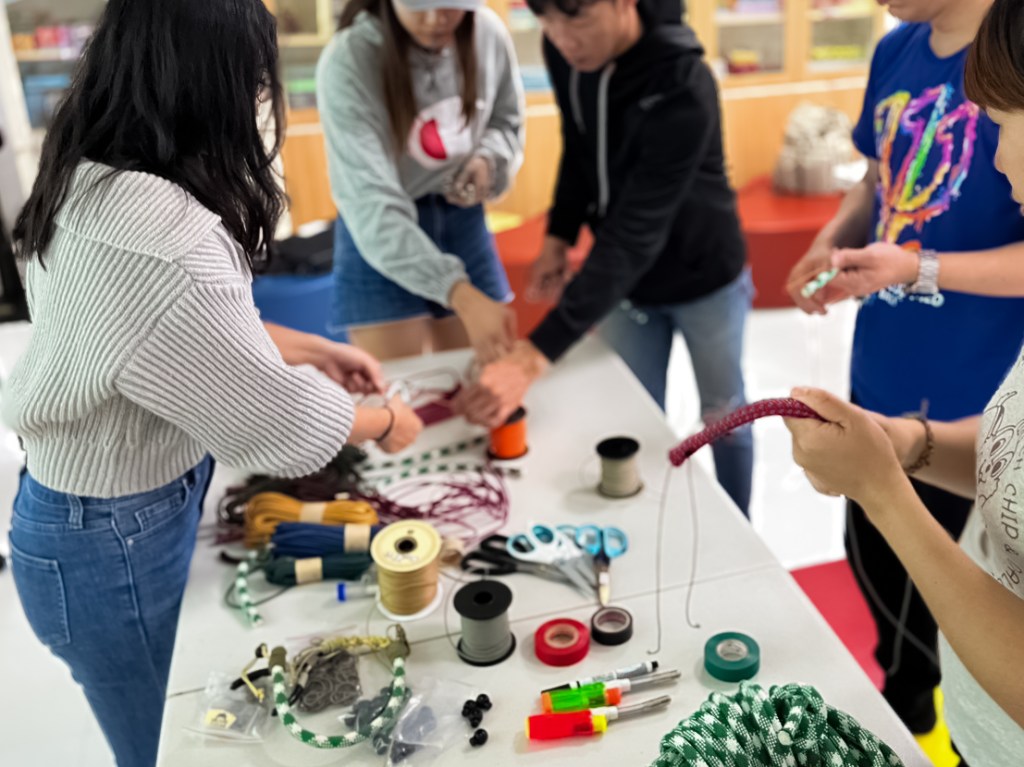 課前材料採購討論時需考量避免浪費,最終選擇了院區未來也能持續使用的傘繩。院方當天精心準備了不同顏色的傘繩讓參與者自由搭配,為作品增添豐富的色彩層次與獨特性。