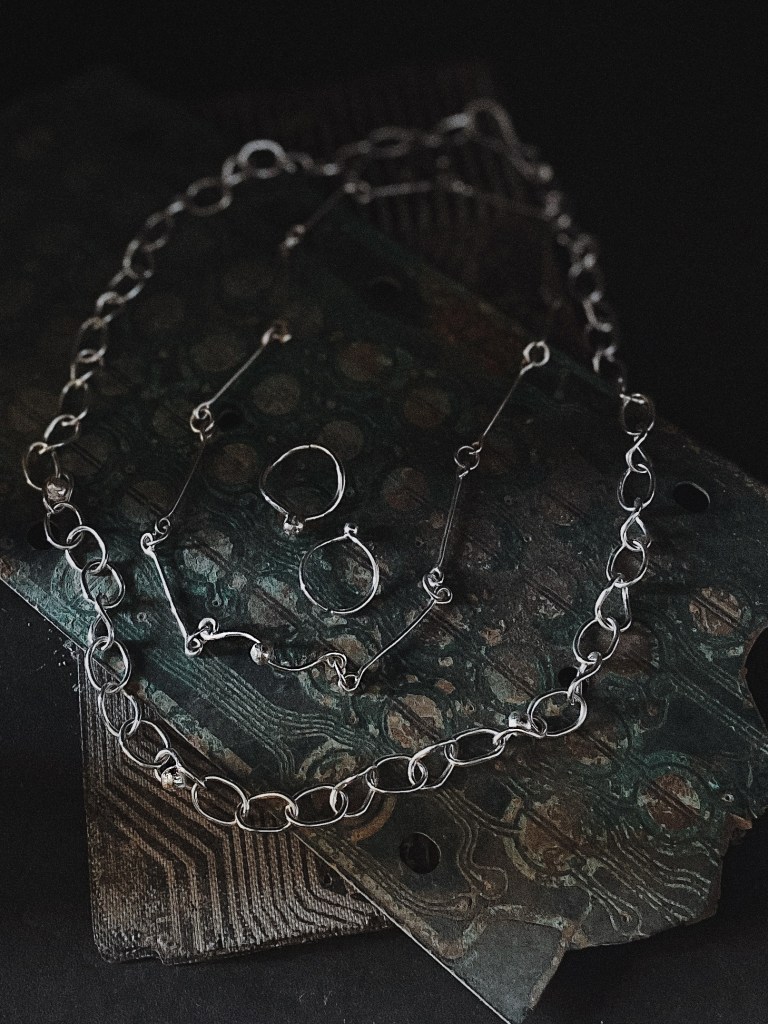 靈感來自銀飾製程中鋸切下的小碎塊,透過燒熔後自然成形,形成每顆不規則的銀球,就像宇宙間碎片撞擊而成的獨一無二行星——地球。